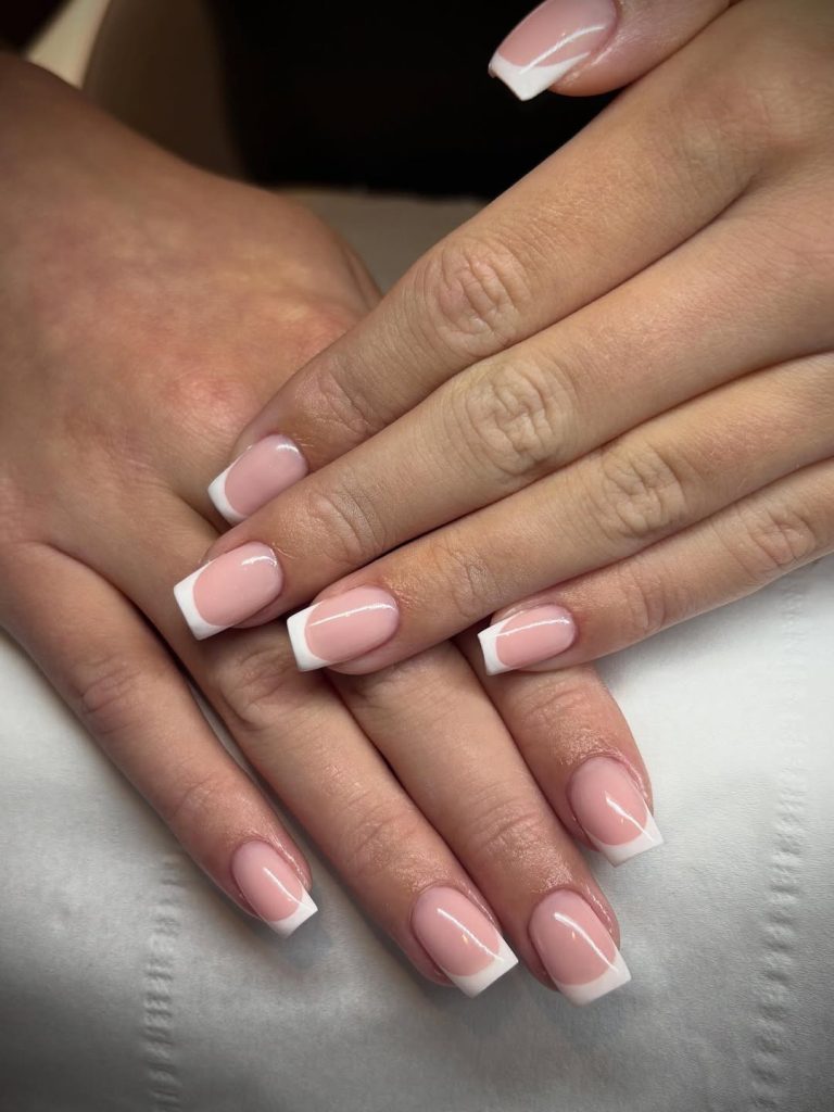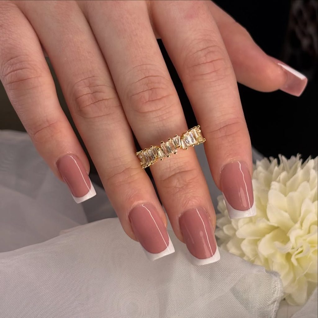 There’s something undeniably reassuring about a short French manicure done this well. The soft pink base feels natural and clean, while the crisp white tips add just enough contrast to look intentional. It’s a look that feels appropriate everywhere—from everyday errands to special occasions.