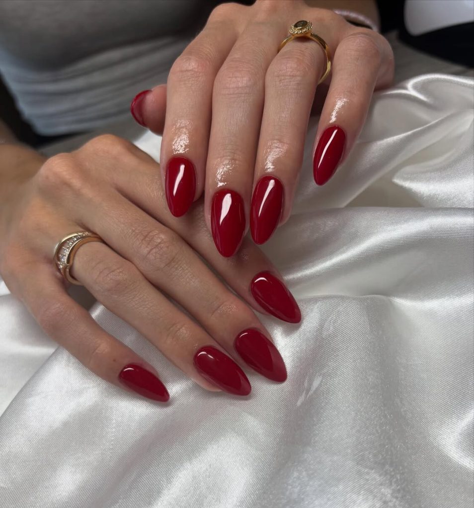 These nails carry presence. The deep red shade feels rich and confident, while the almond shape softens the bold color just enough to keep it elegant. It’s a manicure that suggests assurance and experience—never loud, always intentional.