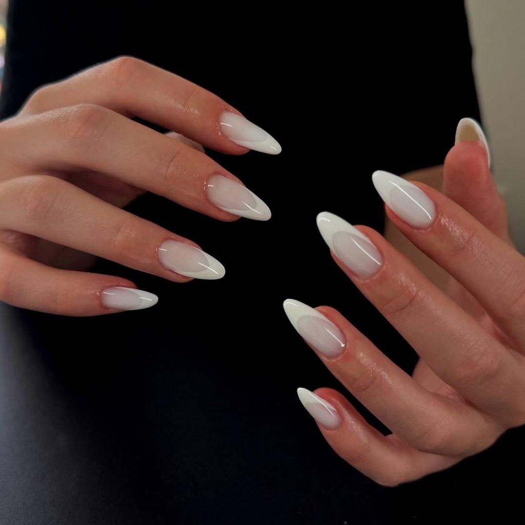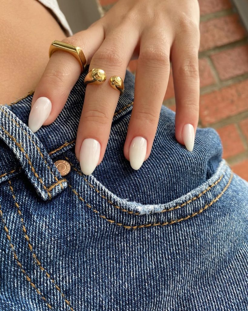 These nails feel quietly luxurious, especially when paired with simple gold jewelry. The creamy white tone is soft rather than stark, giving the manicure warmth and approachability. The almond shape keeps everything elegant, making this look feel composed and intentional rather than trendy.