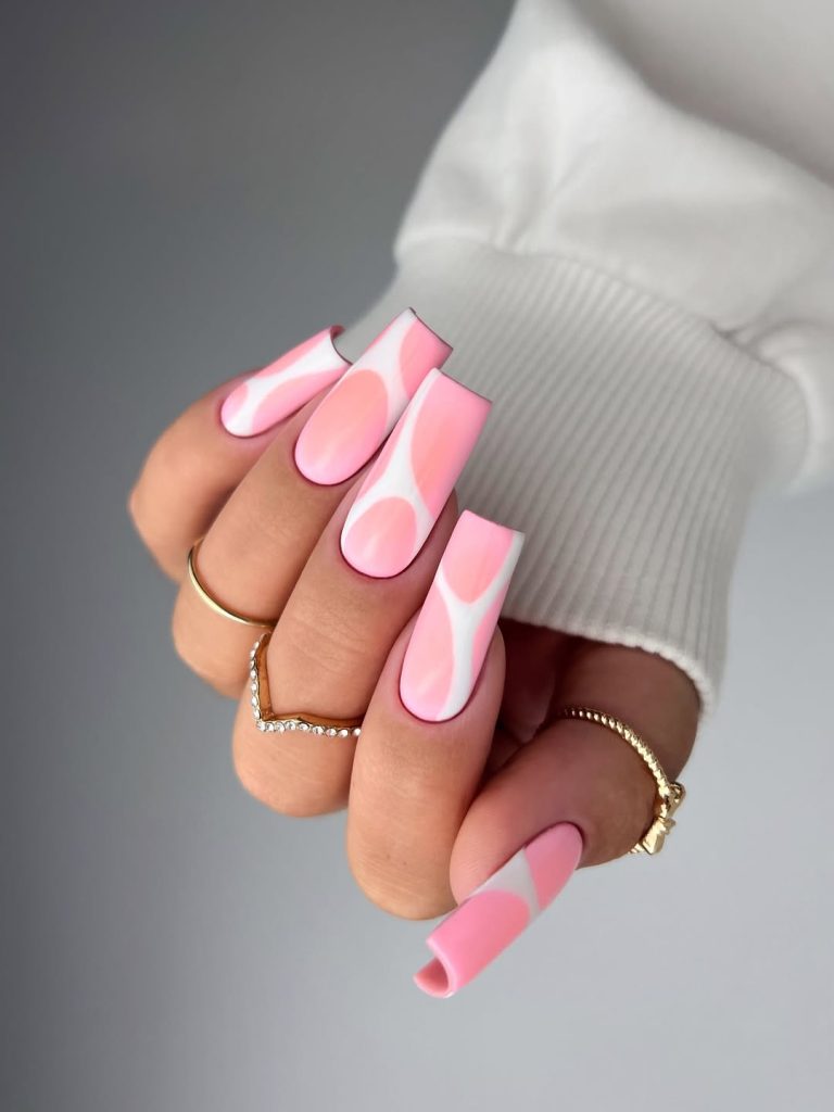 These long coffin nails take on a retro-inspired swirl design in shades of soft pink and white. The bold curves create a groovy aesthetic that feels playful yet chic, almost like wearable art. It’s a manicure that’s confident and modern but still has that nostalgic throwback vibe we’re seeing everywhere in 2026.