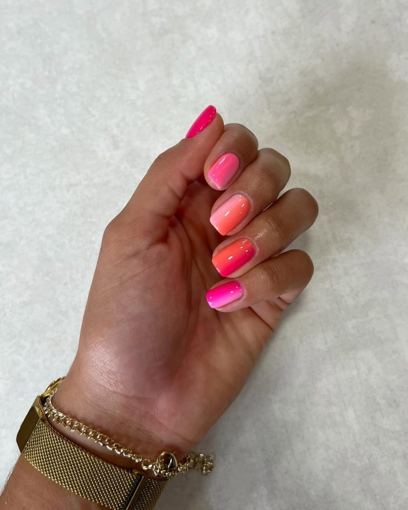 Talk about hot summer inspo—these neon pink and orange nails are bursting with energy. The glossy finish enhances the bright colors, creating a manicure that’s vibrant, youthful, and full of personality. It’s the kind of look that makes even the simplest outfit feel bold.
