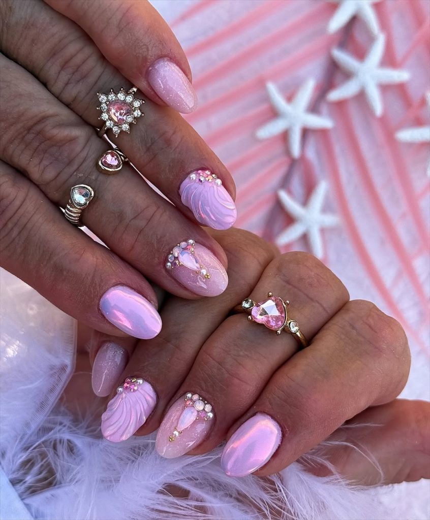 14. Mermaid-inspired pink nails with gems