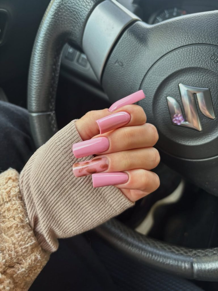 Long and glossy, these nails keep it simple with a soft pink base but add a chic twist with a marble accent nail. The combination feels polished but creative, offering just enough detail to catch attention without being overwhelming. It’s elegant but still playful—the perfect in-between.