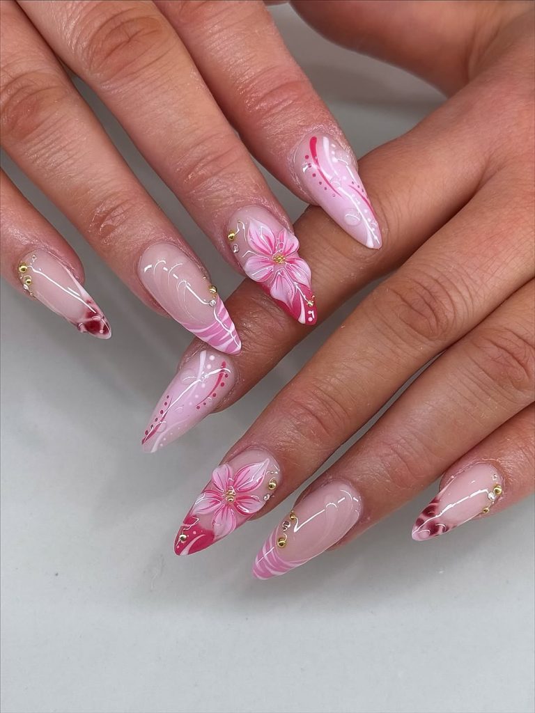 17. Pink floral art nails with gems