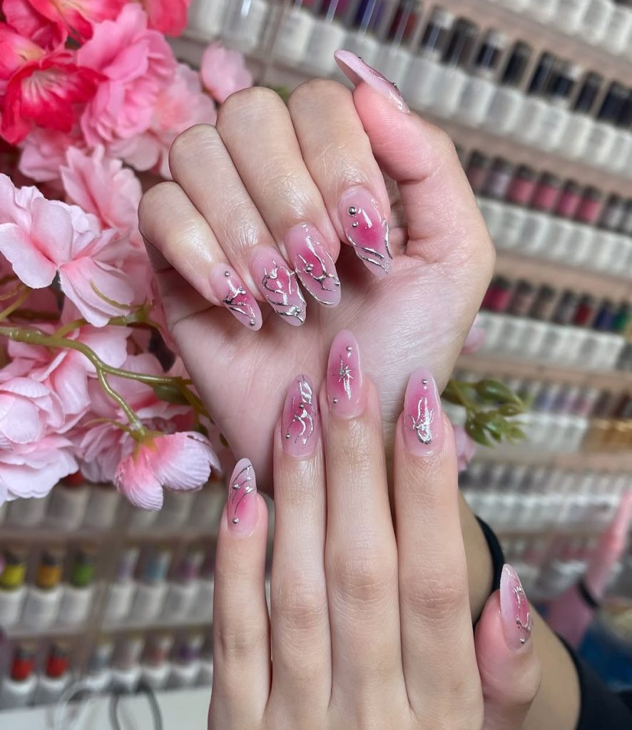 Shiny, modern, and a little edgy—these pink chrome nails with silver streaks are pure glam. The reflective pink base gives them a hot futuristic vibe, while the metallic accents create dimension and drama. They’re nails that demand attention without being too overwhelming.