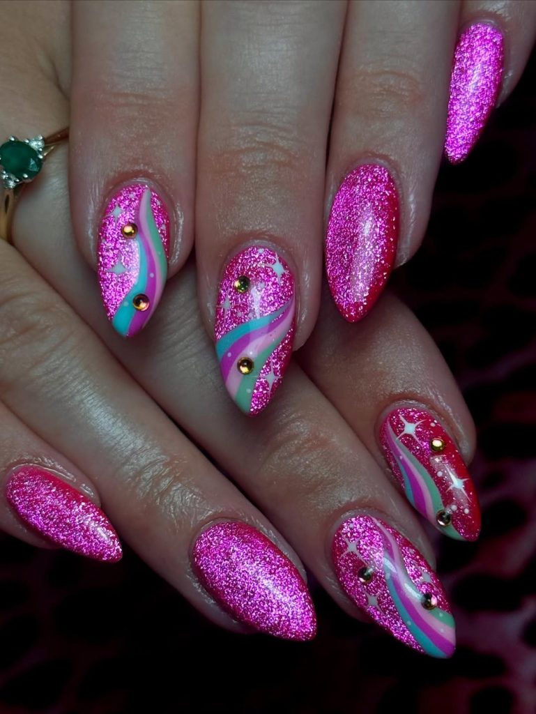 If you love nails that sparkle under every light, these hot pink glitter nails are pure inspo. The dazzling glitter paired with playful swirls of pastel colors creates a fun, almost retro vibe. Tiny gold studs add that extra pop, making the whole look feel like wearable art that’s both cute and bold.
