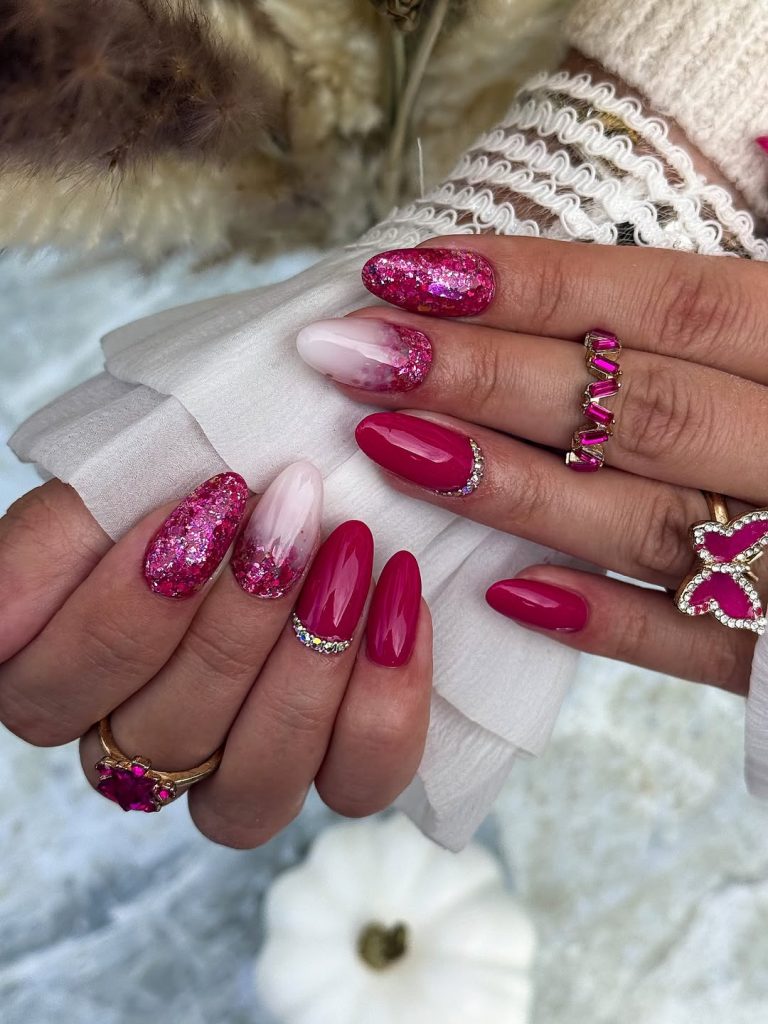 This style is best for almond shapes, where the blend of glitter and solid color stands out beautifully. Compared to softer pinks, this design leans hot and festive, making it perfect for nights out, special occasions, or whenever you want to add sparkle to your day.