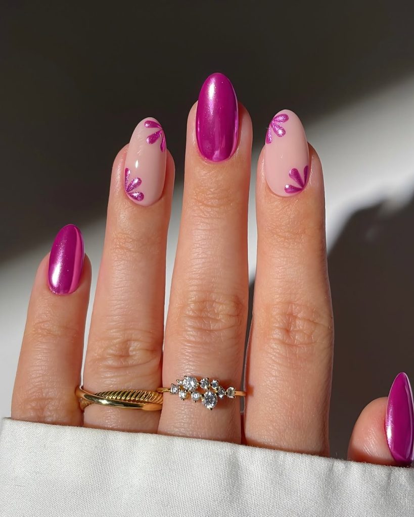 Here’s a softer take on pink nails—a mix of glossy fuchsia paired with nude nails adorned in delicate flower designs. The combination feels romantic yet fresh, like a bouquet captured on your fingertips. It’s playful without being too flashy, perfect if you’re craving something feminine but not overwhelming.