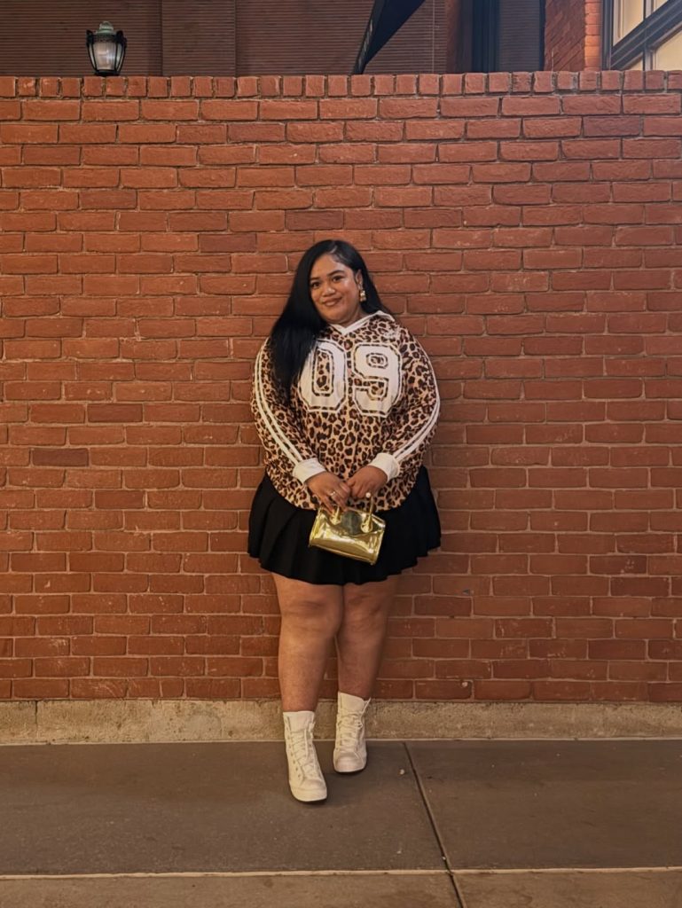 A playful streetwear moment blending a sporty leopard hoodie with a pleated mini skirt—cute, relaxed, and perfect for a casual fall outing.