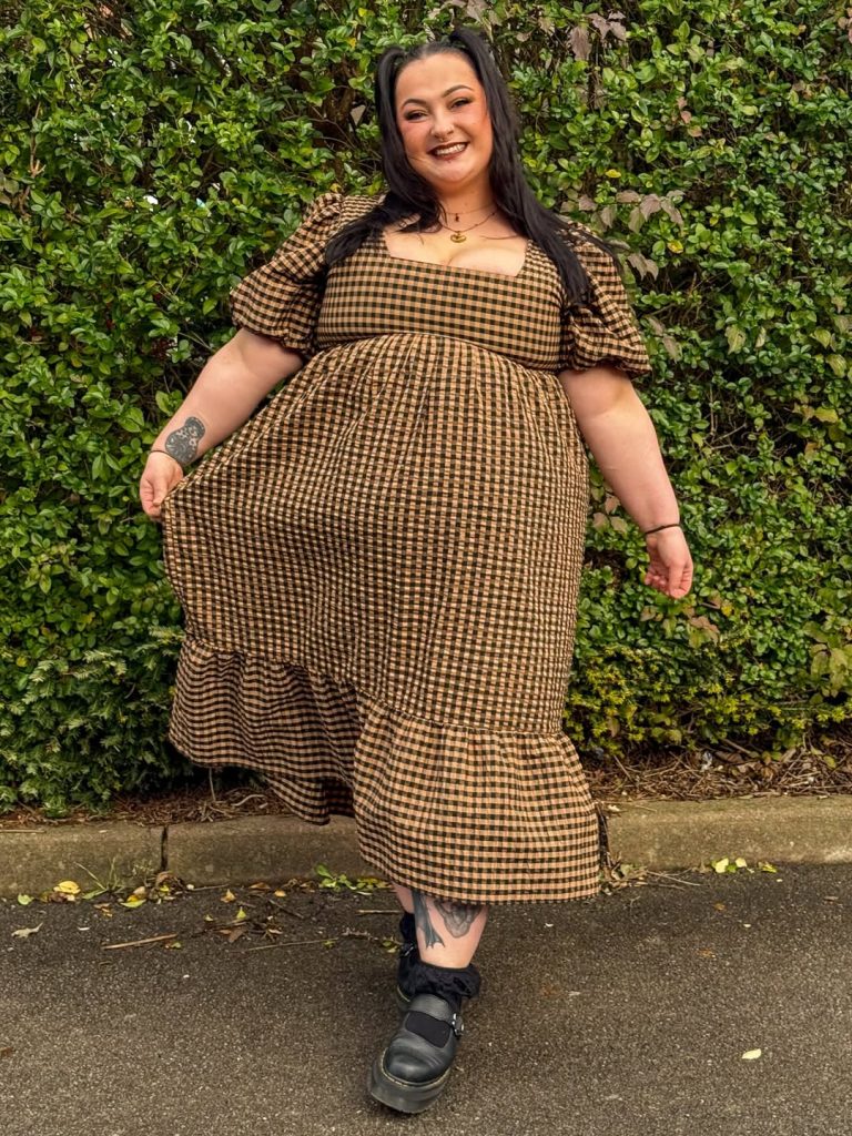A playful gingham dress full of movement—comfortable, cutesy, and ideal for transitional fall moments or sunny weekends.
