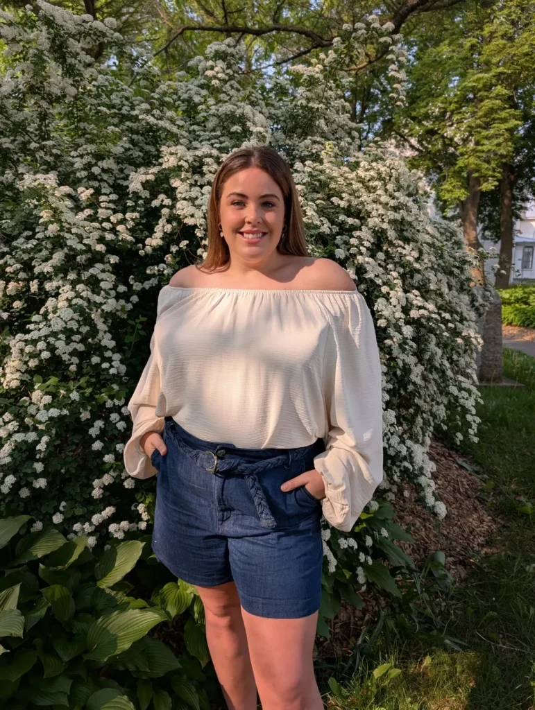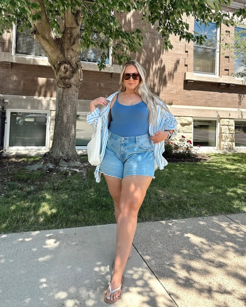 This outfit captures everything charming about light, breathable summer dressing. Great for daytime festivals, boardwalk strolls, or weekend lunches outdoors. A straw tote or soft waves would add personality, while heavy layers should be avoided to preserve the top’s delicate structure. This also doubles well as a summer night look with heeled sandals and soft shimmer makeup. Style bloggers like Gabi Fresh often spotlight similar airy tops for curvy figures.
