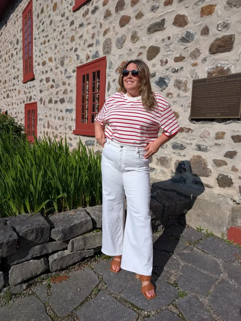 20. Striped Tee, White Wide-Leg Pants & Sandals