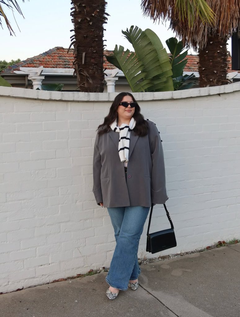 A polished mix of oversized blazer and flared jeans—ideal for that middle ground between business formal and laid-back casual winter appeal.