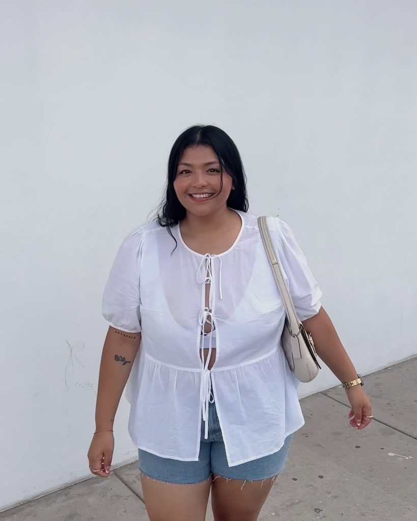 A breezy white tie-front top paired with classic denim jorts—an airy choice that echoes summer, beach walks, and Shein summer-inspired casual styling.