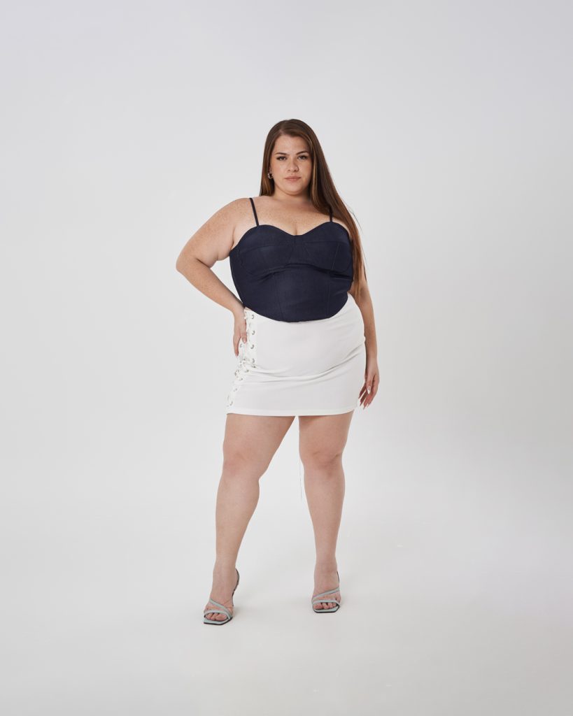 A sleek, dressy pairing that leans into summer date night glamour with a navy bustier and crisp white mini skirt.