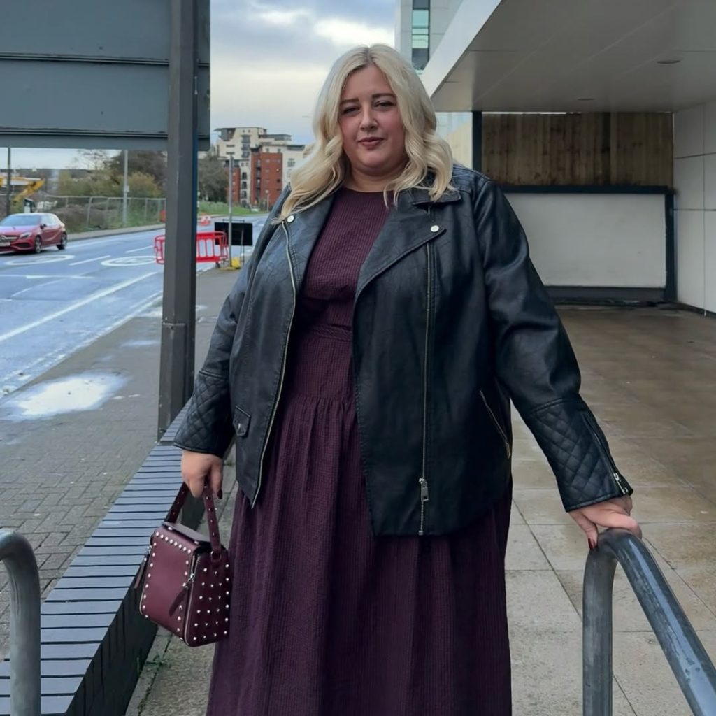 A textured burgundy midi dress topped with a black biker jacket—an effortless mix of feminine and edgy, perfect for autumn 2026 evenings.