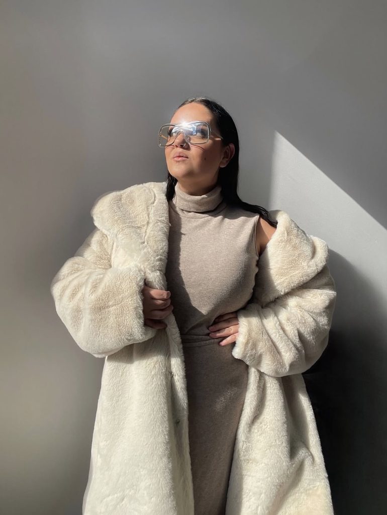 An ultra-soft combination of a taupe knit dress and plush faux-fur coat—perfection for fall 2026 or deep winter dressing.