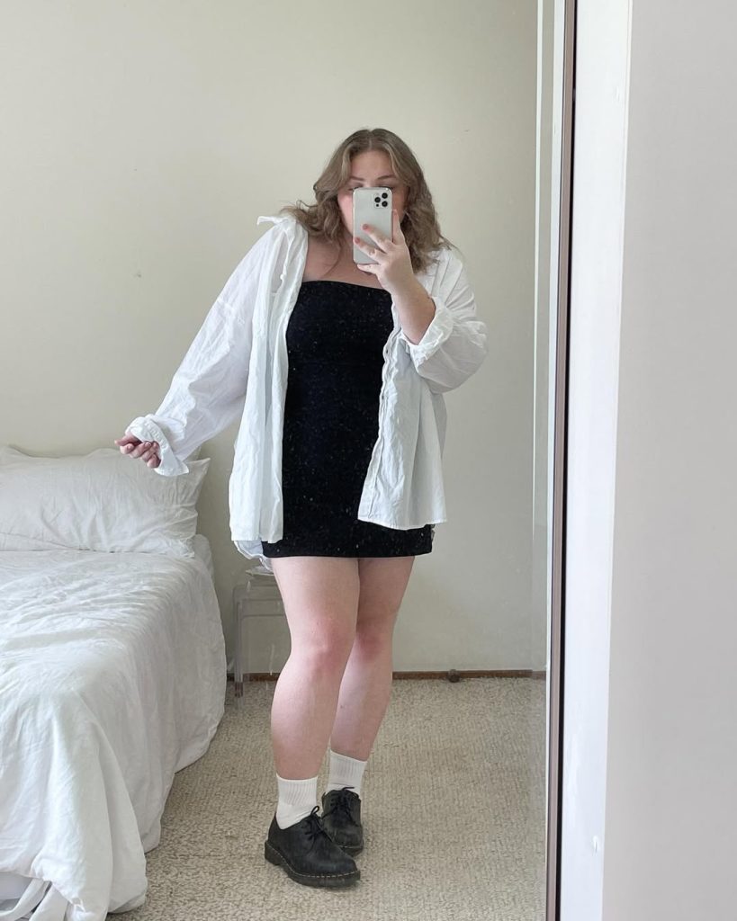 Understated and effortless, this combo pairs a sharp black mini dress with a loose white button-down—minimalist perfection for everyday casual wear.