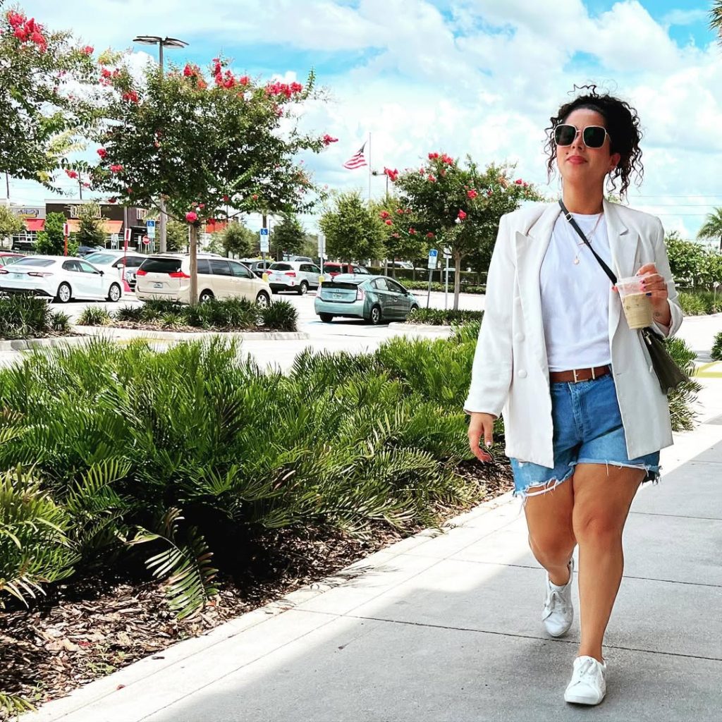 A modern take on casual tailoring featuring a bright white blazer over denim jorts—polished yet carefree, great for transitional fall casual days.