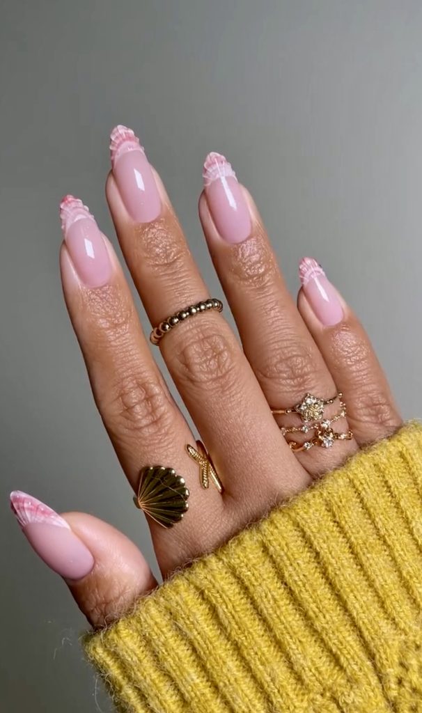 The enduring classic French manicure has been relaunched in the optimistic pink tortoise style. Each haloed by the salty kiss seashell ridges designed in gentle pink shades, the nails all look like they have got a touch of the ocean wave effect. A delicate wave shape at the tip is a subtle and effective reference to the turtle shell without being obvious. This is one of the best designs for a person wanting to wear shell nails that would go perfectly with everyday clothes; especially when paired with golden rings and cozy knits.