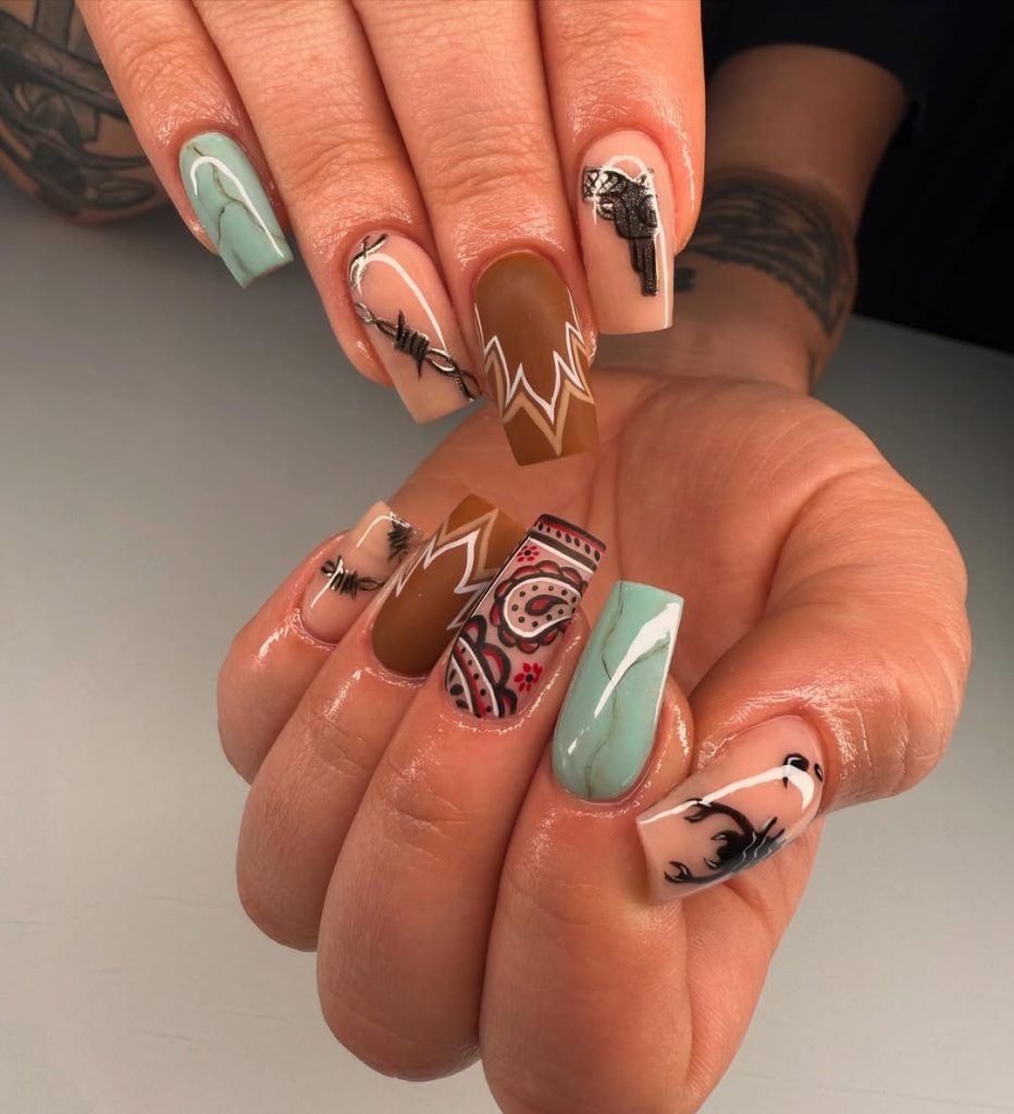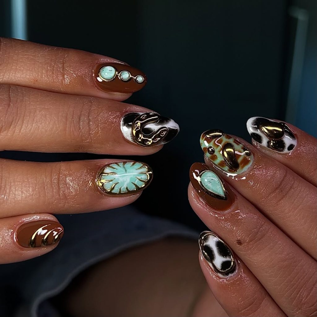This set feels rich, textured, and undeniably luxurious. Deep browns, glossy black accents, metallic gold details, and stone-inspired turquoise elements create a manicure that looks almost like handcrafted jewelry. It’s western but elevated—more boutique than barn.