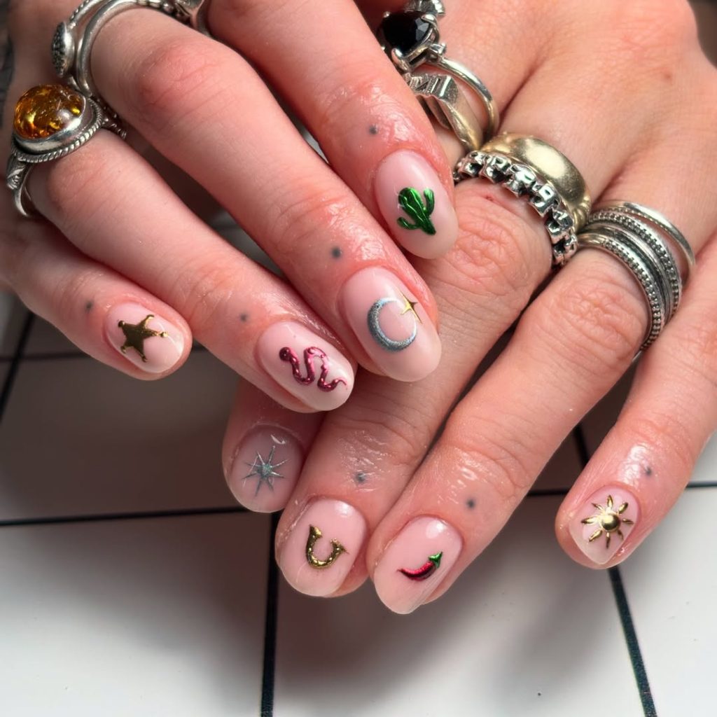 These tiny western icons feel like little treasures scattered across your fingertips. Each nail, featuring a cactus, a crescent moon, a chili pepper, and a horseshoe, narrates a unique and cohesive story. The sheer nude base keeps everything light and wearable, while the metallic accents add just enough sparkle to make them feel special. This design is cute, personal, and full of fun personality.
