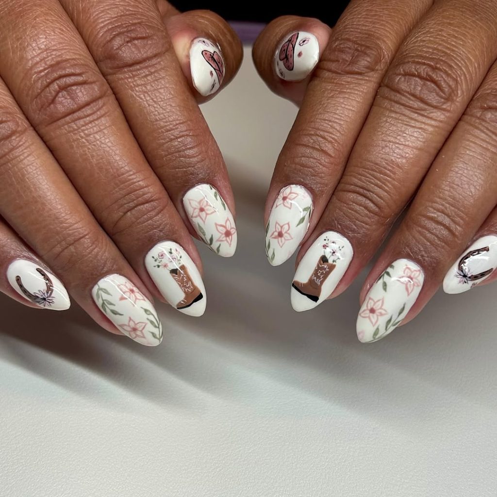 This manicure feels like a western fairytale unfolding across your fingertips. Soft cream polish sets the stage for delicate florals, tiny boots, and subtle horseshoe details. It’s romantic and artistic, blending country charm with spring garden energy. There’s a quiet confidence in these Designs — they don’t shout, they simply glow.