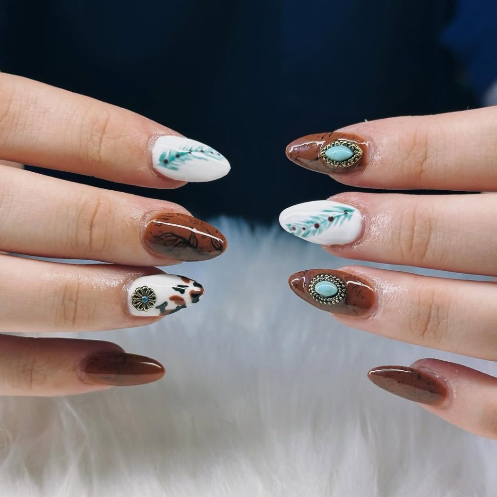 Rich chocolate brown meets crisp white and pops of turquoise in this striking combination. Metallic concho-style accents and stone-inspired details make the manicure feel almost like handcrafted jewelry. It’s earthy, grounded, and undeniably western—but polished in a way that feels modern for 2026.
