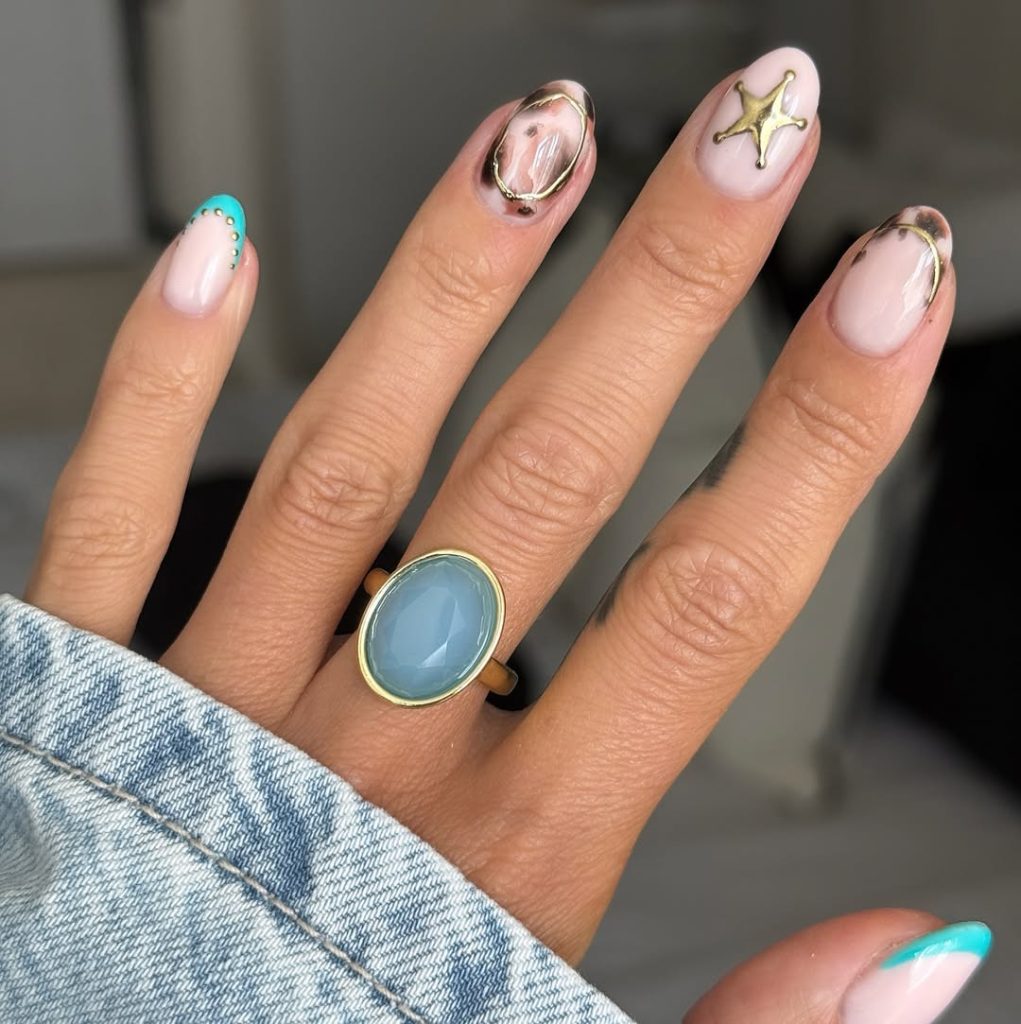 Sometimes less really is more. A soft nude base paired with turquoise tips and a gold sheriff star creates a manicure that feels refined yet playful. The subtle cow print accents and metallic outlines add just enough detail to keep things captivating. It’s western but elevated—like your favorite denim jacket styled just right.