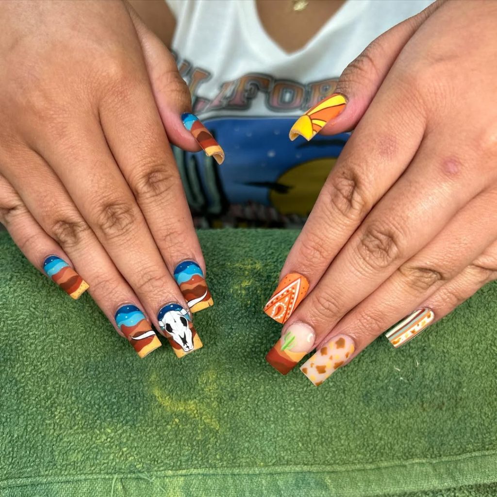 If you’ve ever watched the sky turn gold and orange over a desert landscape, you’ll understand the mood of this manicure instantly. Layered sunset tones, desert silhouettes, and bold western motifs create a statement set that feels fearless and joyful. These are not shy nails—they’re full-on Ideas brought to life with color and personality.