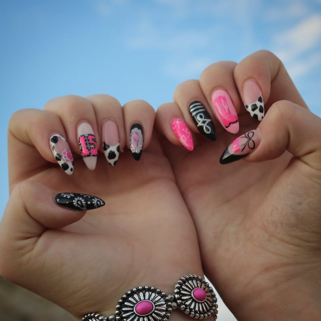 Now this is pure attitude. Bright pink paired with black cow print, bandana details, and graphic western lettering creates a manicure that refuses to blend in. It’s bold, fearless, and unapologetically Fun. If you’ve ever wanted your nails to feel like a rodeo concert outfit, the present is your moment.