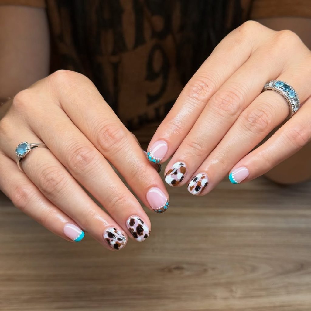 Soft pink bases paired with cow-print French tips feel surprisingly fresh and wearable. Tiny turquoise dot accents along the cuticle line add just enough western charm without overpowering the look. This cute manicure is perfect for errands and weekend plans.