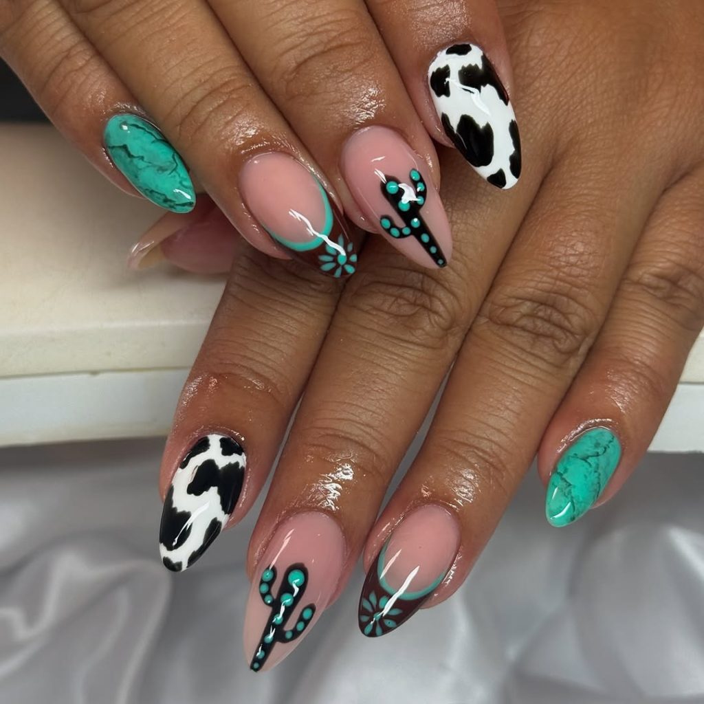 Turquoise marble, glossy cow print, and delicate western line art create a manicure that feels powerful yet refined. The combination of nude bases with bold accent nails makes each finger feel intentional. It’s dramatic without being heavy—a modern cowgirl aesthetic with a polished finish.