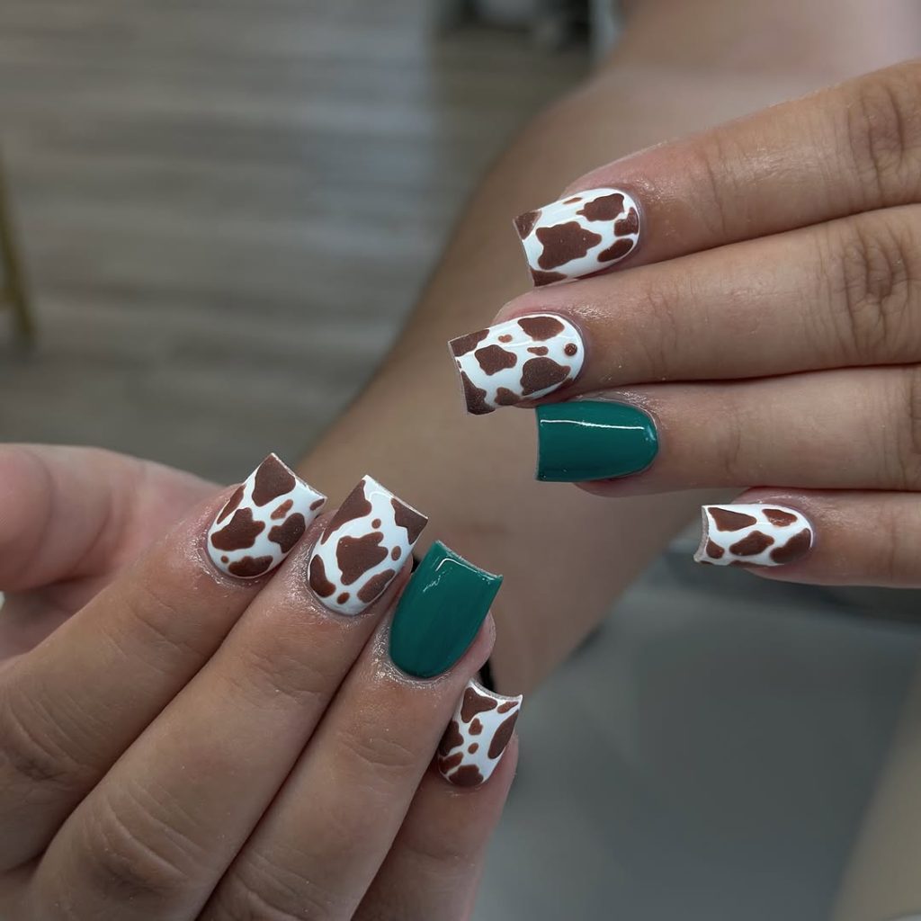 Brown, white, and turquoise come together here in the most satisfying way. The glossy cow print, warm chocolate tones, and bright turquoise accent nail create contrast that feels both rustic and modern. It’s western style distilled into a clean, wearable manicure.