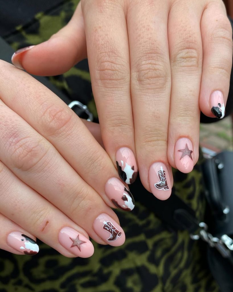 Soft blush pink, subtle cow print accents, and tiny boot and star details create a manicure that feels sweet and playful. It’s the kind of look that makes you smile every time you glance down at your hands. The artwork is delicate and clean, which gives the overall vibe a cute and approachable feel.