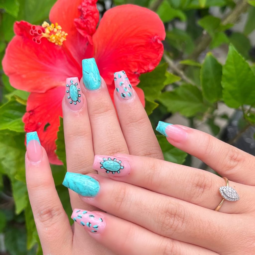 26. Turquoise Blossom Cowgirl Nails