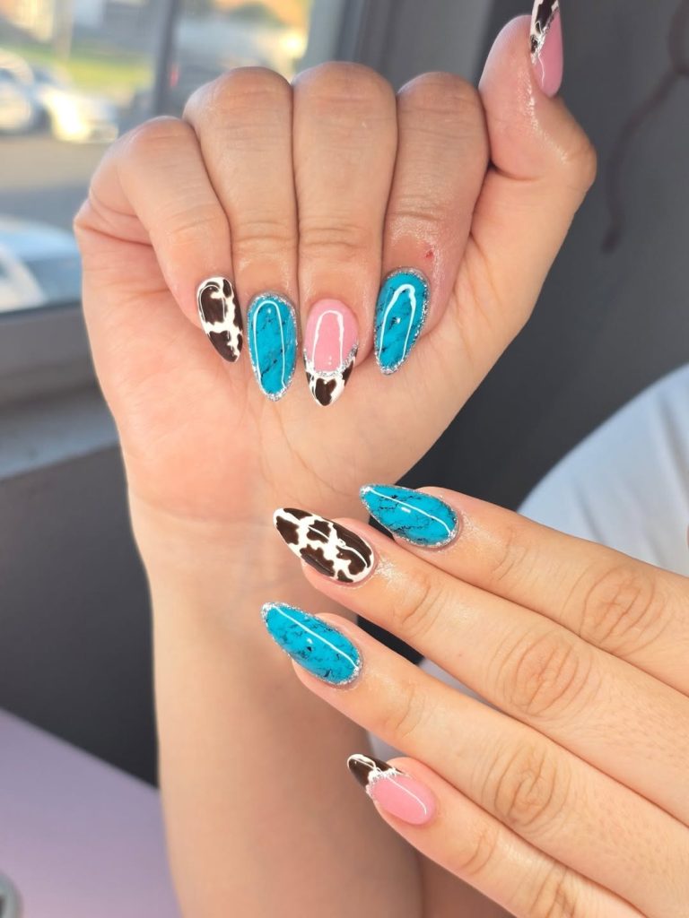 The crisp turquoise outline framing glossy pink and cow print accents feels so fresh and modern. The combination of stone-inspired panels with subtle glitter edging gives this manicure texture without overwhelming it. It’s western style with a clean, contemporary twist.