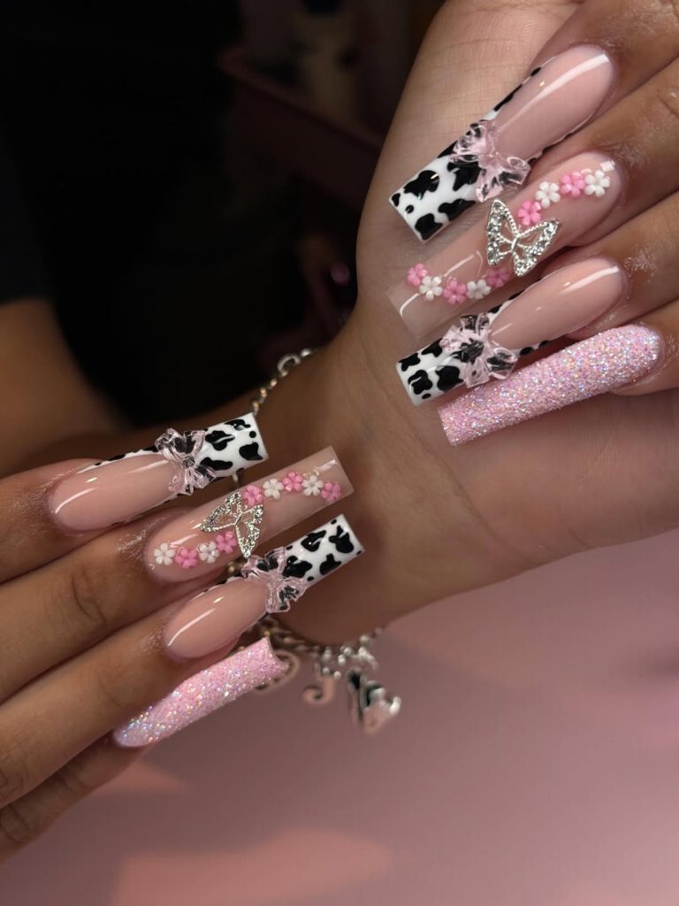 Soft blush tones meet cow print, delicate florals, sparkling butterflies, and glossy bows in this ultra-feminine set. It’s sweet, romantic, and just a little extra—like dressing up your western vibe with a touch of glam. The glitter accent nail adds playful sparkle without overpowering the softness.