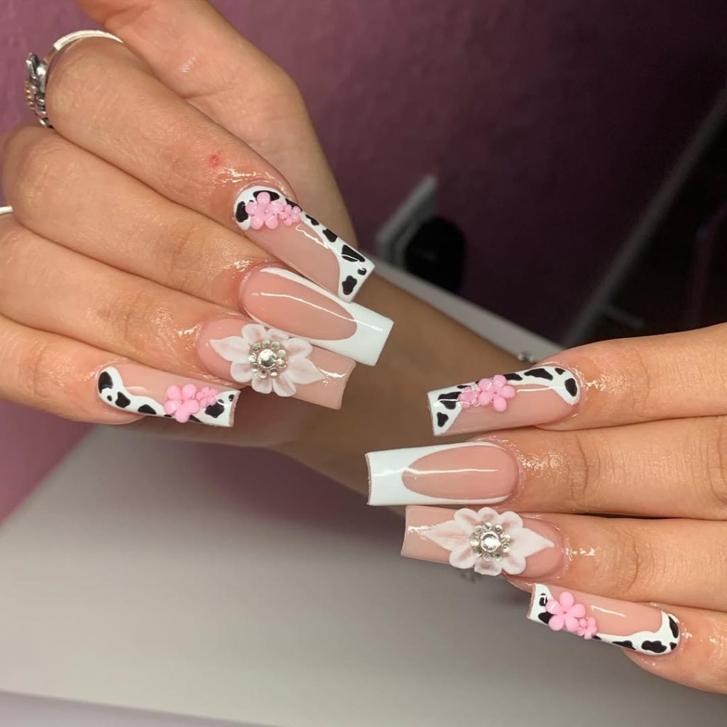 3. Cow Print French with Floral Accents