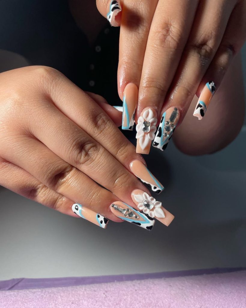 This manicure feels like wearable art. Nude bases layered with bold cow print accents, blue striping, silver details, and a striking 3D flower create a dramatic yet cohesive western look. There’s texture, shine, and movement in every angle—it’s impossible not to notice.
