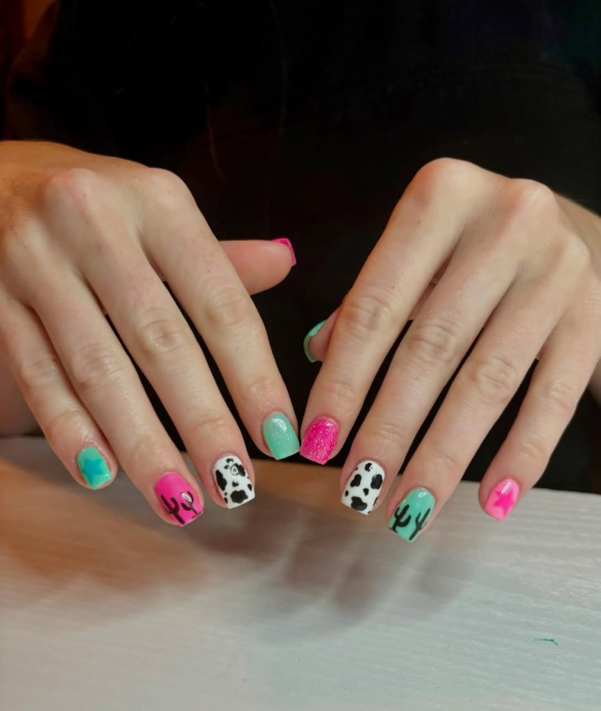 The combination of bright turquoise, hot pink, and playful cactus art is truly captivating. Yes, please. This short manicure demonstrates that a statement can be made without the need for length. The mix of bold colors and cow-print accents gives it an unmistakable western vibe, but the overall feel is lighthearted and cute—perfect for spring days filled with sunshine.