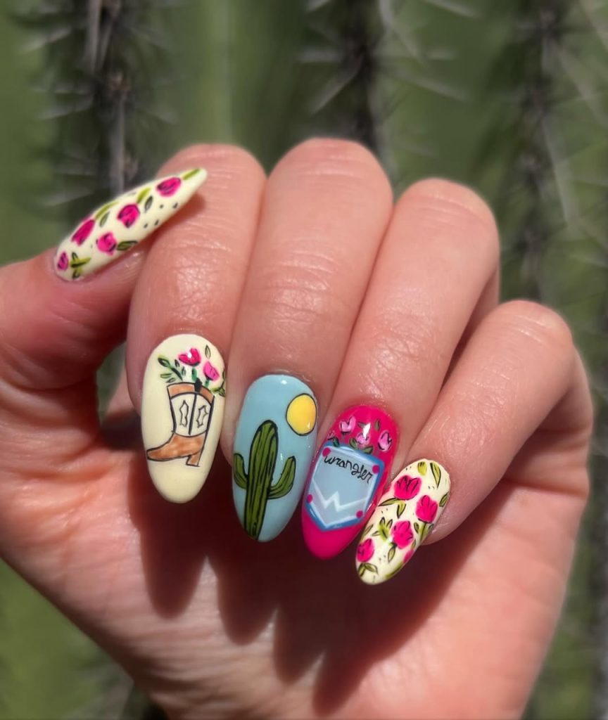 This set feels like a tiny western fairytale painted on your fingertips. Soft yellow, sky blue, and bright pink create a cheerful base for delicate florals, a cowboy boot illustration, and desert scenery. It’s playful, detailed, and full of personality—the kind of manicure that sparks compliments everywhere you go.