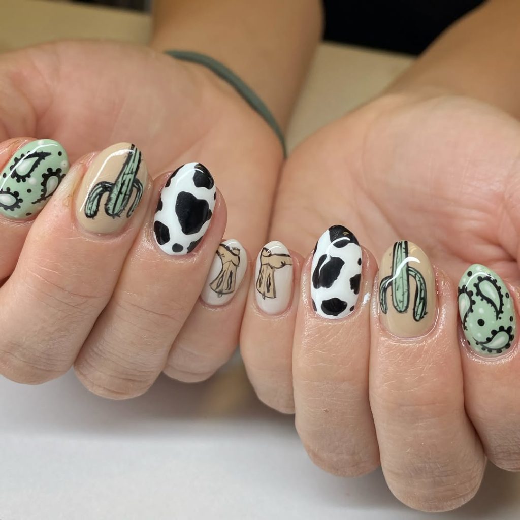 13. Western Paisley & Cow Print Almond Nails
