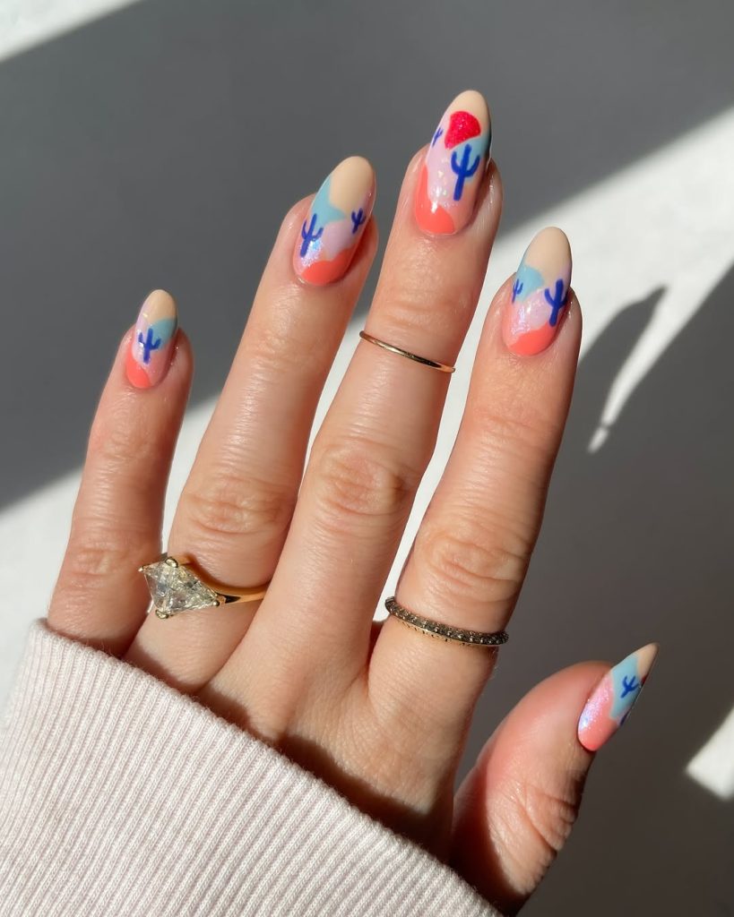There’s something almost magical about this pastel desert scene. Blended coral, sky blue, and creamy nude create a dreamy sunset effect, while tiny cactus silhouettes add just the right touch of western Inspo. The glossy finish catches the light in the prettiest way, making the whole manicure feel fresh and optimistic.