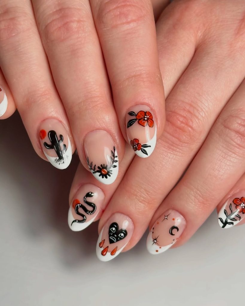 This manicure has attitude in the best way. Black snakes, tiny stars, red florals, and bold desert motifs create a western tattoo aesthetic that feels edgy yet polished. The creamy white base keeps everything balanced, so even with all those details, it still looks cohesive and stylish.