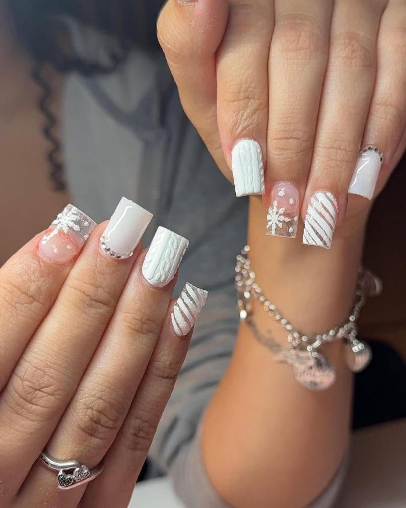 The thing about this set of white square nails, is that they give a feel like wrapping oneself in soft winter knits; very elegant and classy. The combination of cable-knit nail textures with candy cane stripes and delicate snowflakes is adorable and elevated. It is the kind of manicure that instantly puts you in the mood for the holidays, still without going all out, much like a soft blanket on a wintry December morning.