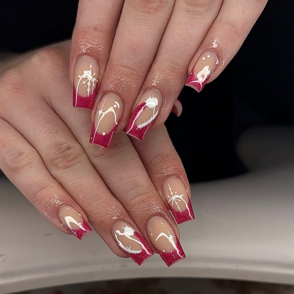 If you love a playful yet elegant manicure, these red sparkle French tips are a stunning choice. The white abstract accents and starburst details add movement and festive flair, making the nails look like they’re twinkling under Christmas lights.