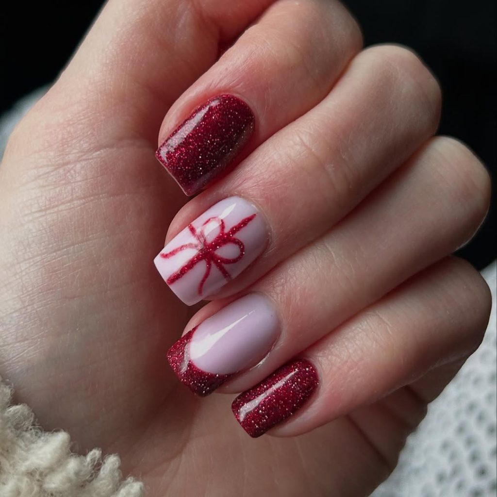 This manicure looks like a beautifully wrapped present waiting under the tree. The red glitter base brings a festive sparkle, while the single accent nail with a delicate bow design adds a playful touch. The mix of glossy pink and shimmering red makes the look both elegant and joyful, perfect for holiday celebrations.