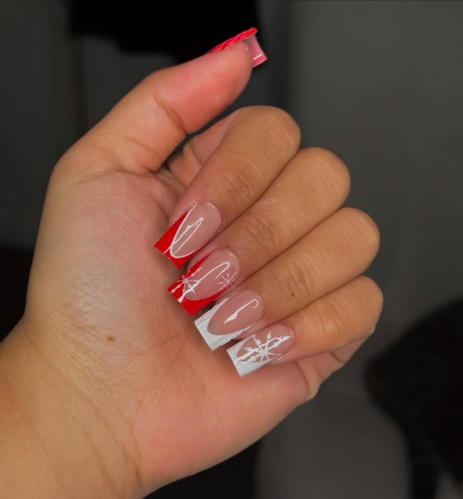 Crisp red and white tips give this design a modern, graphic twist on classic Christmas nails. The snowflake accents add a soft winter touch, creating a perfect balance of bold and delicate. It’s playful without being overcomplicated, making it a great choice for anyone who loves clean holiday designs.