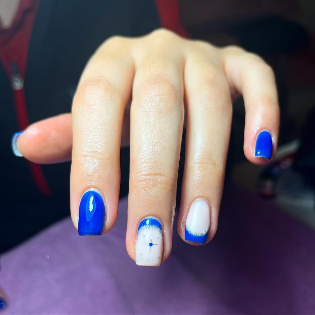 For those who love a cooler palette, this bold blue manicure is striking. The combination of solid blue nails and soft white accents with silver details gives a crisp, wintry vibe reminiscent of starry December nights. It’s unexpected yet classy, making it a fresh option for 2025.
